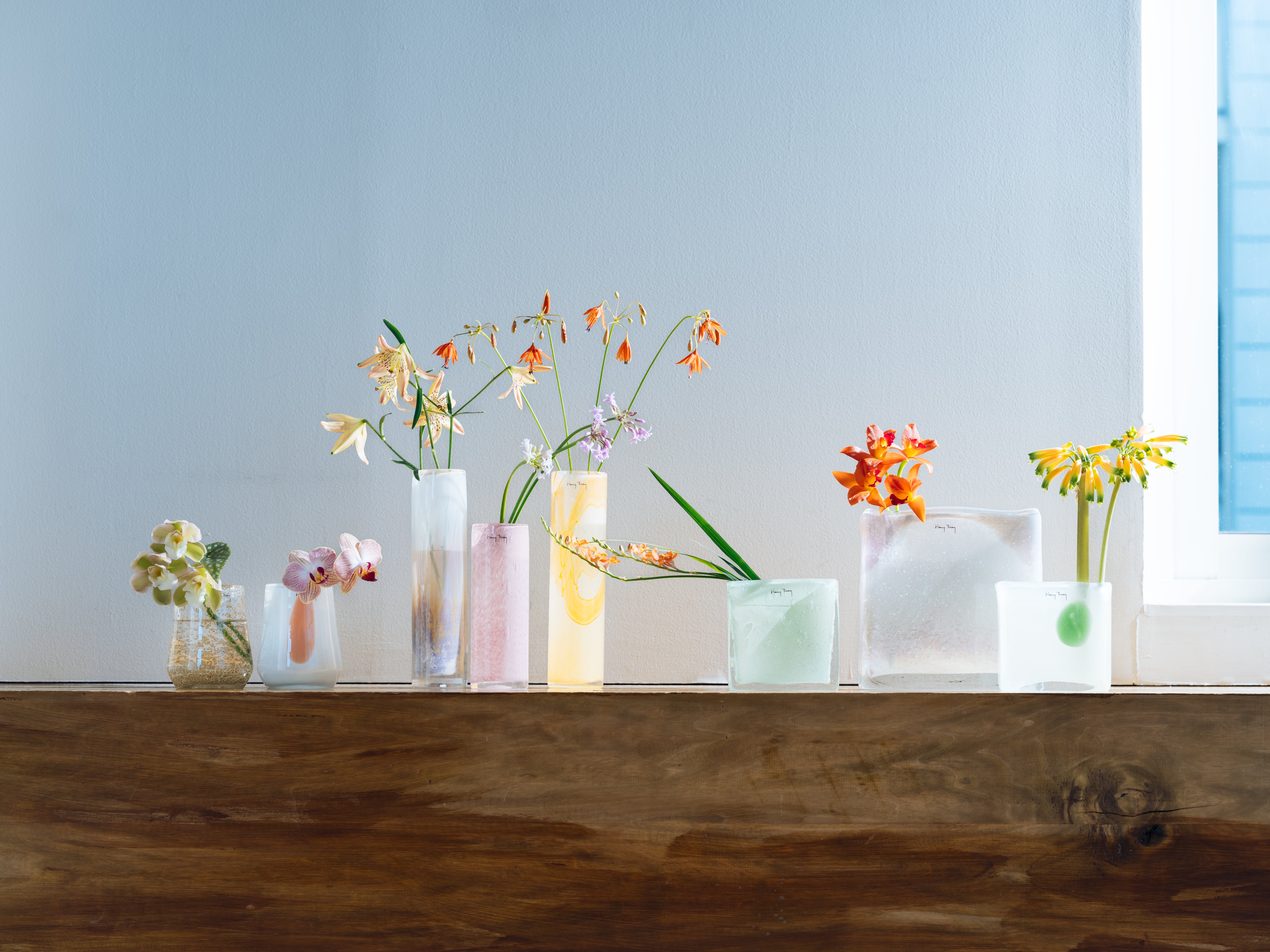 1972年にヘンリー・ディーンが創設したベルギーのフラワーベースブランド。昔ながらの手吹きガラスの手法によって生まれるやわらかなフォルムと揺らぎ、自然や日常のワンシーンから想起する洗練された色をまとったフラワーベースは、アートピースのような佇まいながら、つい触れたくなるような温かみをもっています。